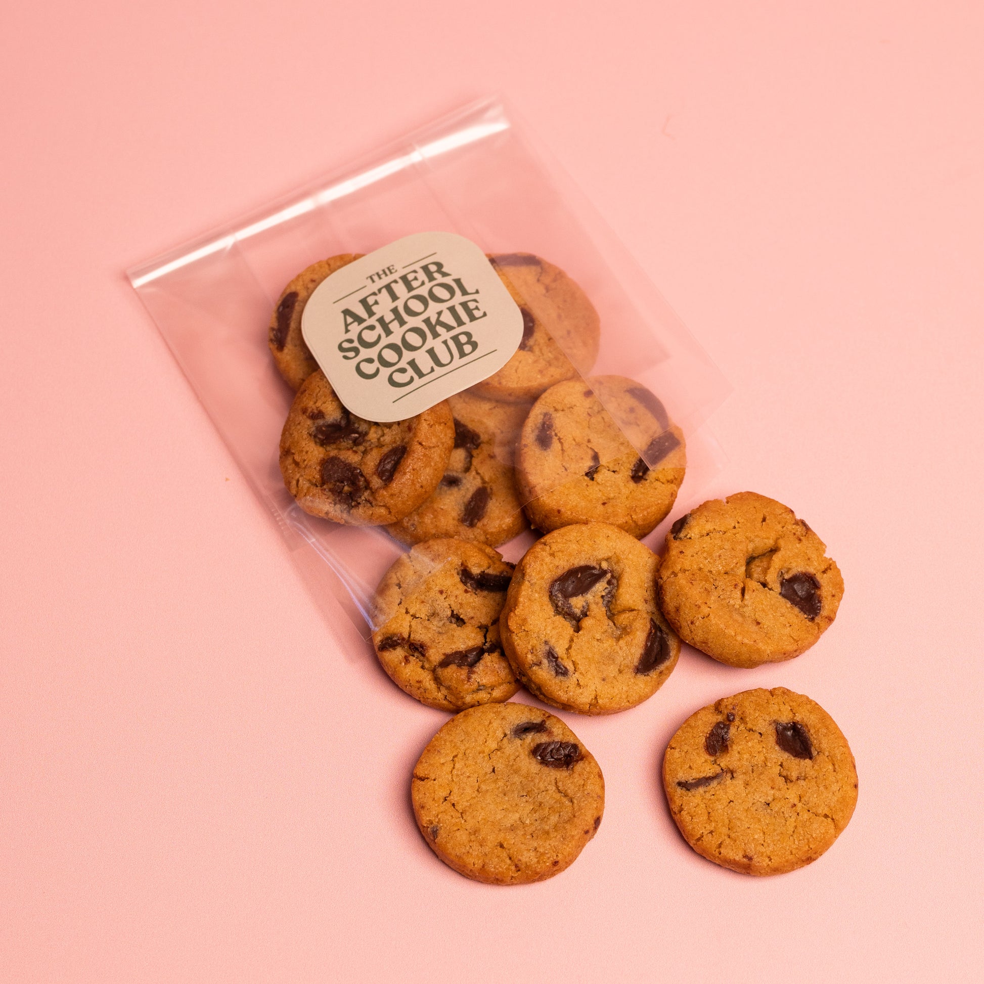 Indulge in our Choc Chip mini Cookies. A little bag of classic comfort, featuring perfectly baked bites filled with rich, melty vegan chocolate chips in every bite. Ideal for snacking, sharing, or dunking in your favourite hot drink.